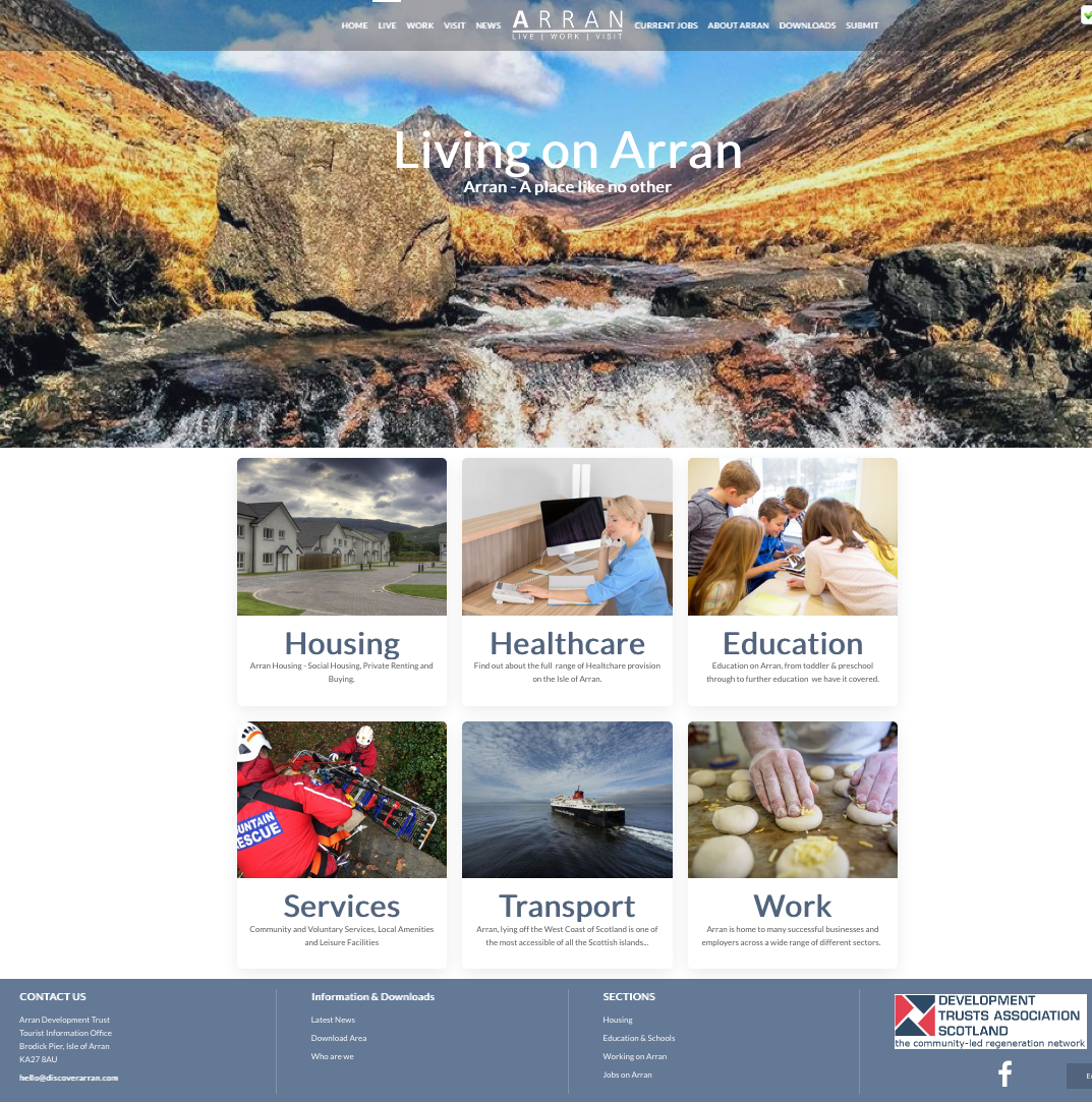 The purpose of the website is to promote Arran as a desirable place to Live and Work, supplementing the VisitArran website which promotes Arran as a place to Visit. As well as featuring a Jobs Board for vacancies on the Island, a Downloads section for relevant public documents and a soon to be rolled out Directory for local businesses and organisations, the website will direct visitors to the main information sources on the Island around Education, Health and Social Care, Jobs, Business and Community.